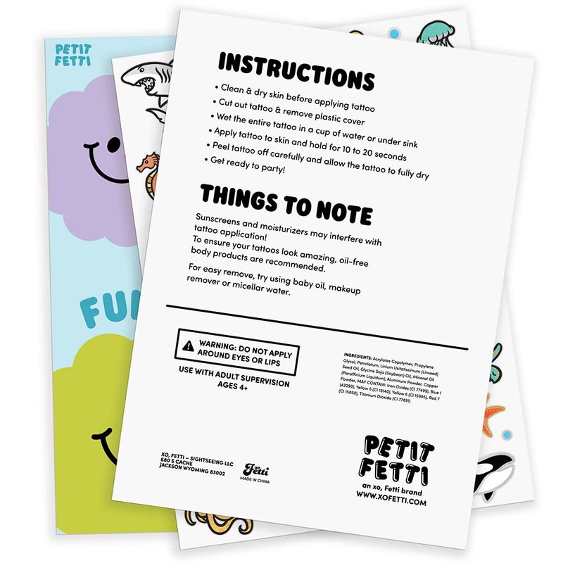 Ocean Tats! Ensure your party goes swimmingly with this floppin' fun set of temporary tattoos! 2 sheets totaling 50 tats means there's one for every silly star fish at the party - no fish left behind! :) Make a splash at your party with these tattoos that feature tons of sea creatures like: sharks, crabs, sea turtles, octopus, whales, fish, stingrays, star fish, jellyfish + seahorses! Sounds like a stellar sea party to us! Party tested + approved... our tattoos will last day into night! Oh, hey! We are xo, Fetti and we’re your one-stop shop for all your party supply needs. We believe life is a party, and you should decorate accordingly! Whether your vibe is an all-nighter at the club, a poolside party, or a living room disco setup straight out of the 70’s - consider yourself ready, set, planned. It wouldn’t be a celebration without you… and us. Normally we don’t like to invite ourselves, but some say the party don’t start til we walk in. So are we coming or what?!