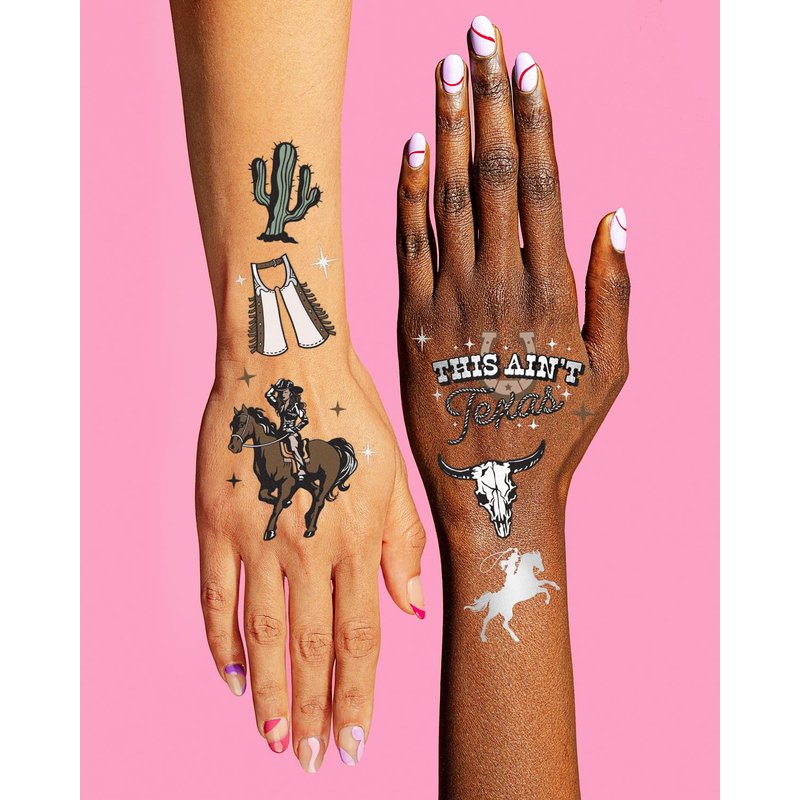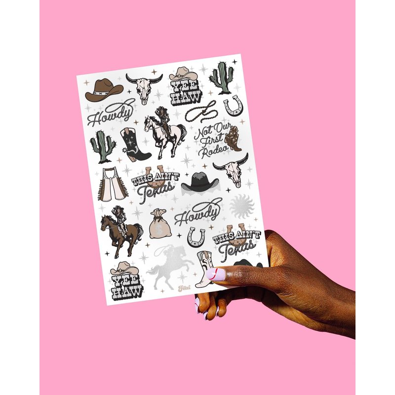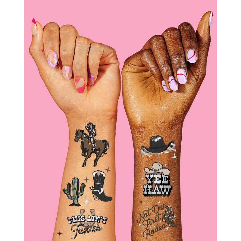 - For Every Cowgirl or Cowboy: two sheets with a total of 50 color + iridescent foil tattoos featuring hand drawn designs of cowgirls, boots, hats, chaps, horseshoes + more that guests will absolutely love!