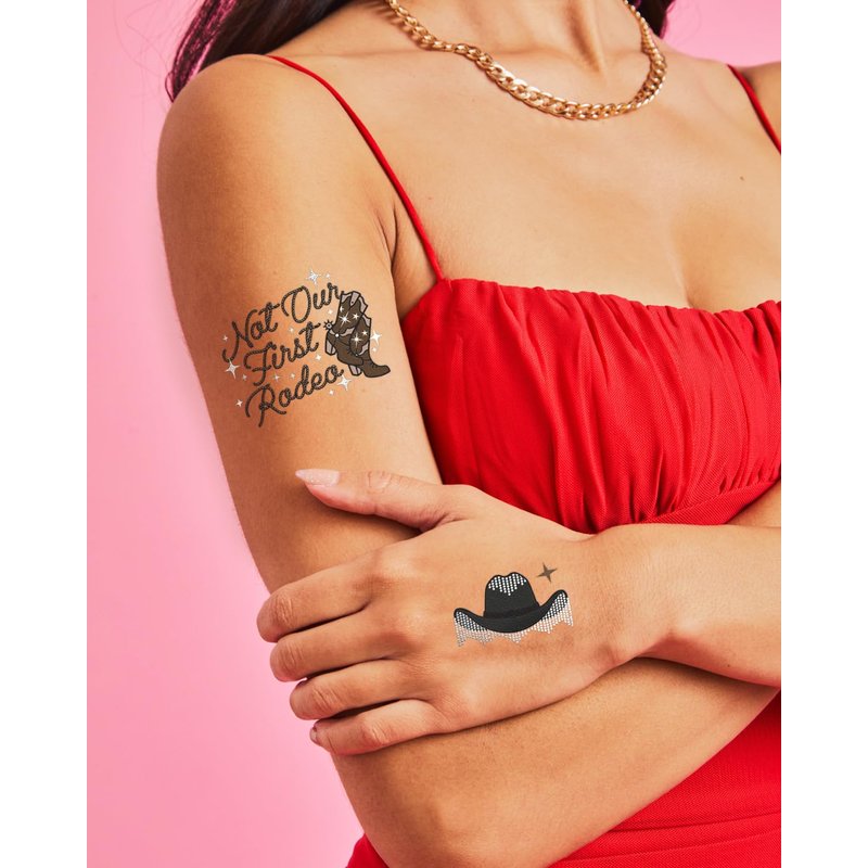 Headed down to the rodeo?! Strut your way into a super cool western party with this black, brown, white + silver foil set of temporary tattoos! 2 sheets totaling 50 tats means there's one for everyone - no cowboy or cowgirl gets left behind :) Elevate your party with these silver foil tattoos that feature all sorts of fun western designs: cowgirls, boots, hats, chaps, horsehoes + more! Party tested + approved... our tattoos will last day into night!