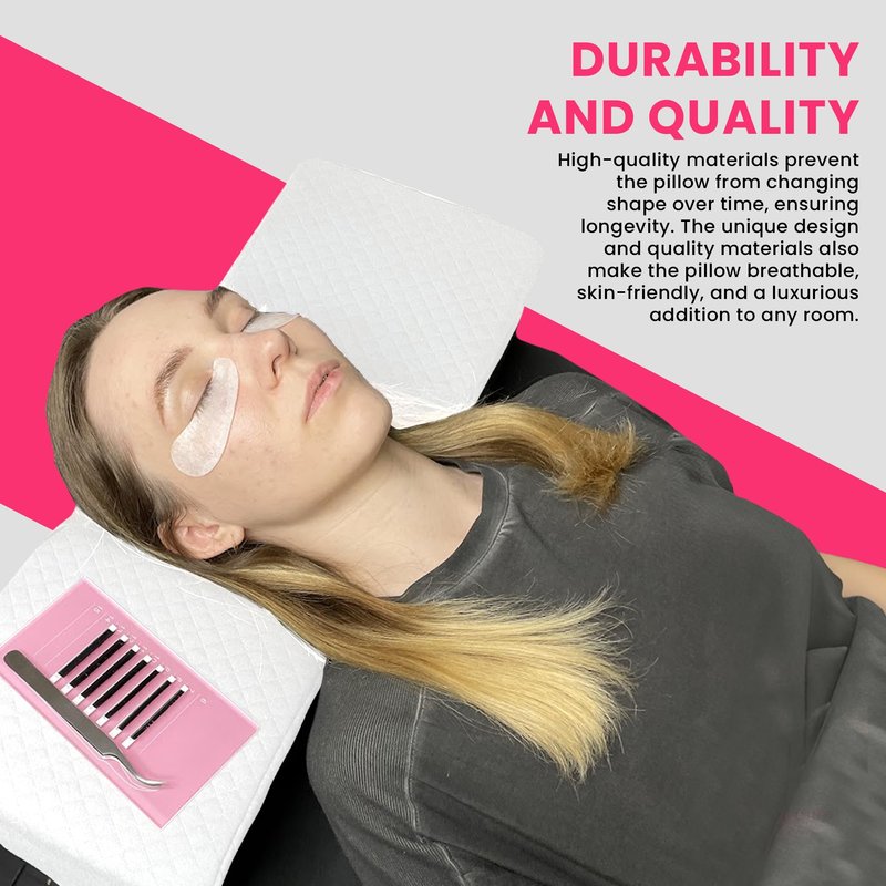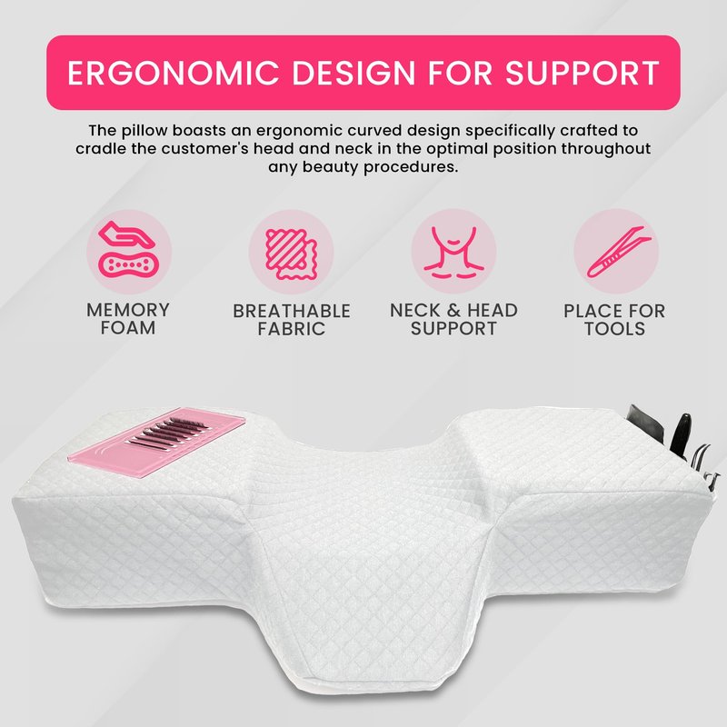- [ORTHOPEDIC DESIGN] - The eyelash pillow has an ergonomic curved shape design to support the head of the customer in the right position during the lengthy process of lash extension. The extension wedge of the lash extensions pillow supports the customer’s upper back and dorsal spine for maximum comfort.
