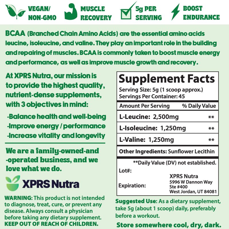 Premium Unflavored BCAA Powder Muscle Growth: Branched Chain Amino Acids (BCAA) leucine, isoleucine, and valine are popular muscle boosting gym supplements for men and women. Men and women on BCAA powder unflavored enjoy our BCAA without caffeine or sugar. Extend your workout with our top rated amino acid powders in your creatine bcaa mix and get ripped! Athletic Performance: BCAA no sugar helps to boost your metabolism. Our BCAA amino acids powder is easy to take. Try it in a pre workout strawberry kiwi smoothie or protein powder fruit orange drink. Many love to mix it with their protein supplement for women. Add it to more than 400 flat tummy recipes for a low carb, keto lifestyle. Post Workout Supplement: Mix our original BCAA powder workout supplements into your post workout protein powder shake. Add it to your fruit punch protein powder or blood orange yogurt to create a BCAA flavoured powder. All muscle can benefit from branch chain amino acids powder. Great as a sport recovery drink or make unflavored recovery water. Muscle Recovery: Most people take our BCAA to boost muscle mass. BCAA amino acids supplement for women plays a role in lessening muscle fatigue. If you like BCAA old school post workout aminos for your workout recovery drink, try blending it into a bcaa creatine drink with our XPRS Nutra creatine powder for recuperador muscular. Love Your Supplements: You'll love the superior quality of our BCAAS recovery supplements. Here at XPRS Nutra, our first priority is ensuring that we are providing our customers with premium amino acids supplement for men in an ethical manner, at an affordable price. Don't like the taste? Try filling BCAA recovery powder to make bcaa gel caps.