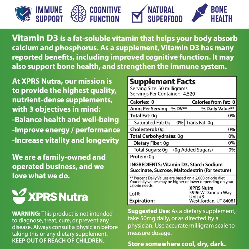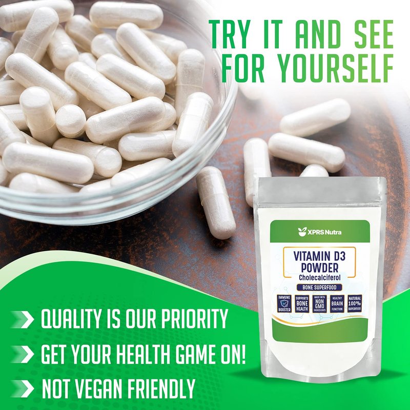 - Love Your Supplements: You'll love the superior quality of our Vitamin D bulk powder. Here at XPRS Nutra, our first priority is ensuring that we are providing our customers with premium supplements in an ethical manner- at an affordable price. Try using our empty capsules to fill your vitamin D3 Cholecalciferol pure vitamin d3 5000iu.