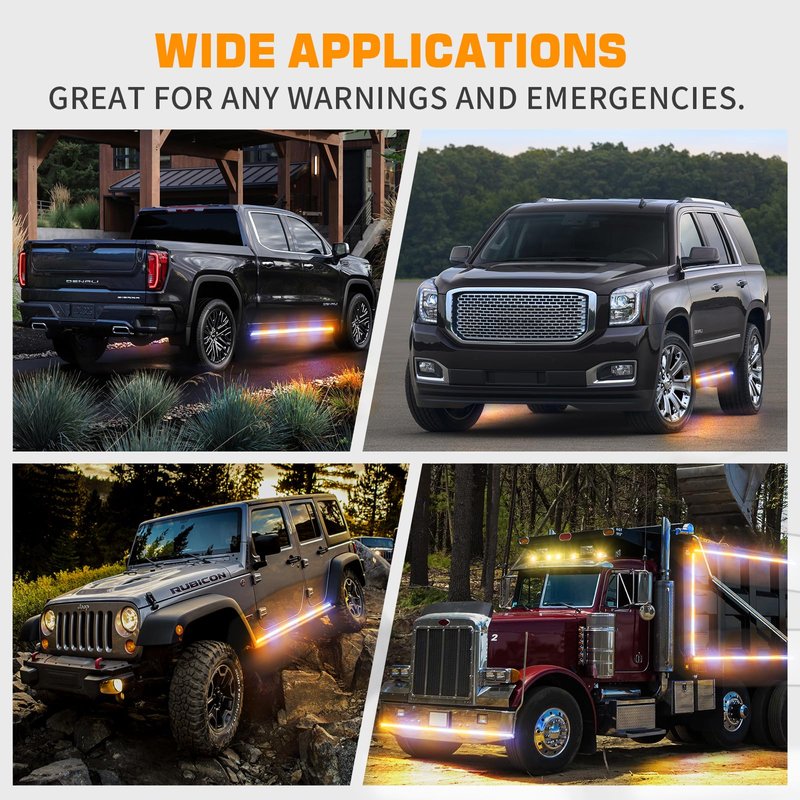 - 【HIGH-QUALITY】This emergency vehicle lights is well-made and lightweight, low consumption, and a service life of 50,000 hours.The clear plastic tube is completely sealed for safe use in harsh weather. Whole led strobe lights strip is IP67 waterproof.