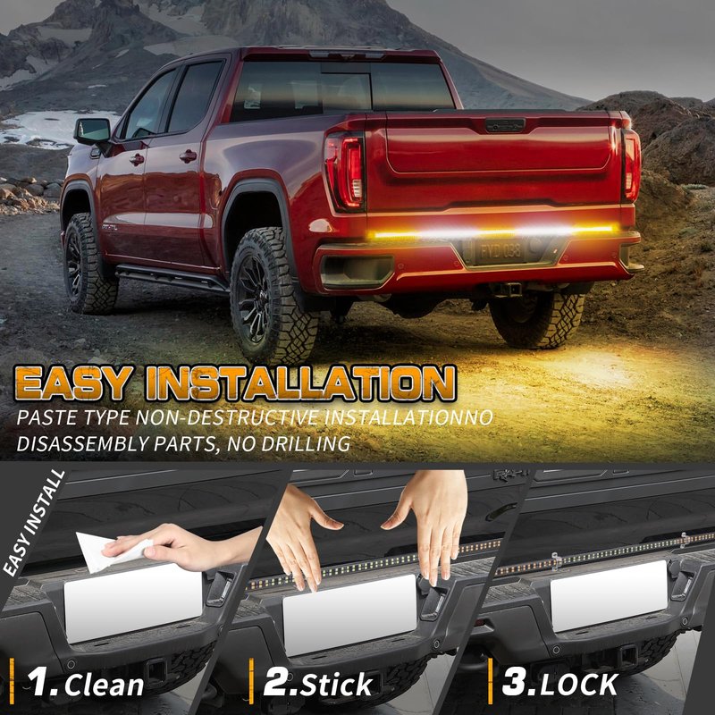 - 【EASY TO INSTALL】No need to drill, just clean and wipe the mounted surface and peel and stick the tailgate strip lights by using high viscosity self-adhesive tape for secure installation. Strong adhesive and clear locks ensure stable installation.