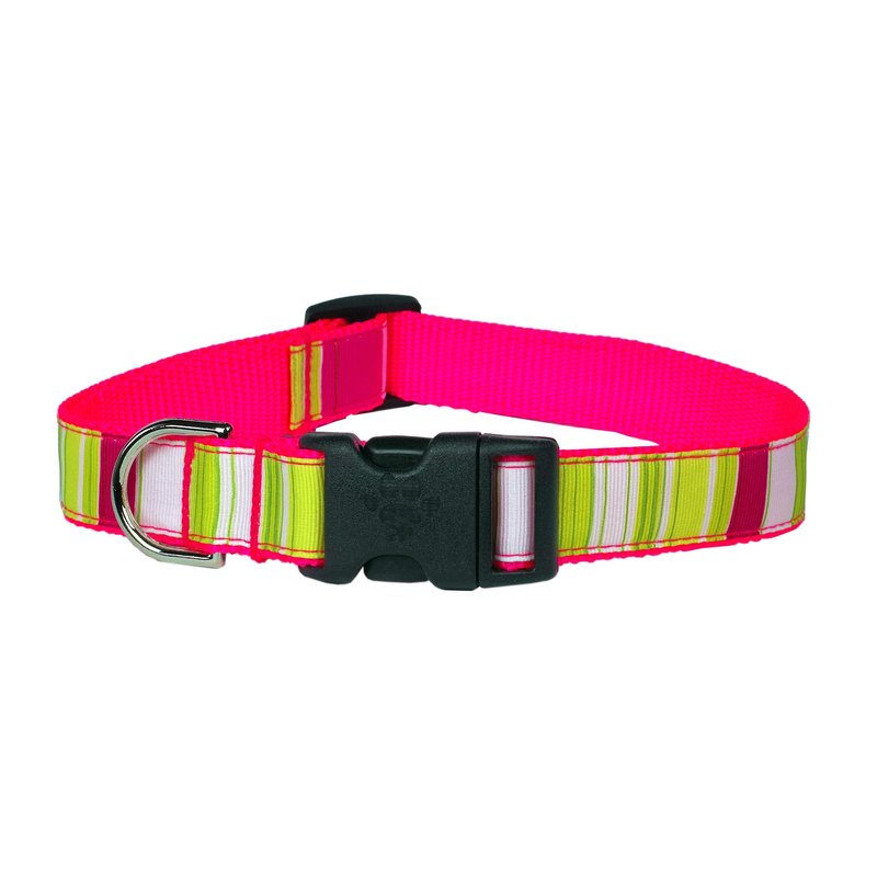 - X-Small Neon Pink/Multi Stripe Dog Collar: 1/2" wide, Adjusts 6-12" - Made in USA.
