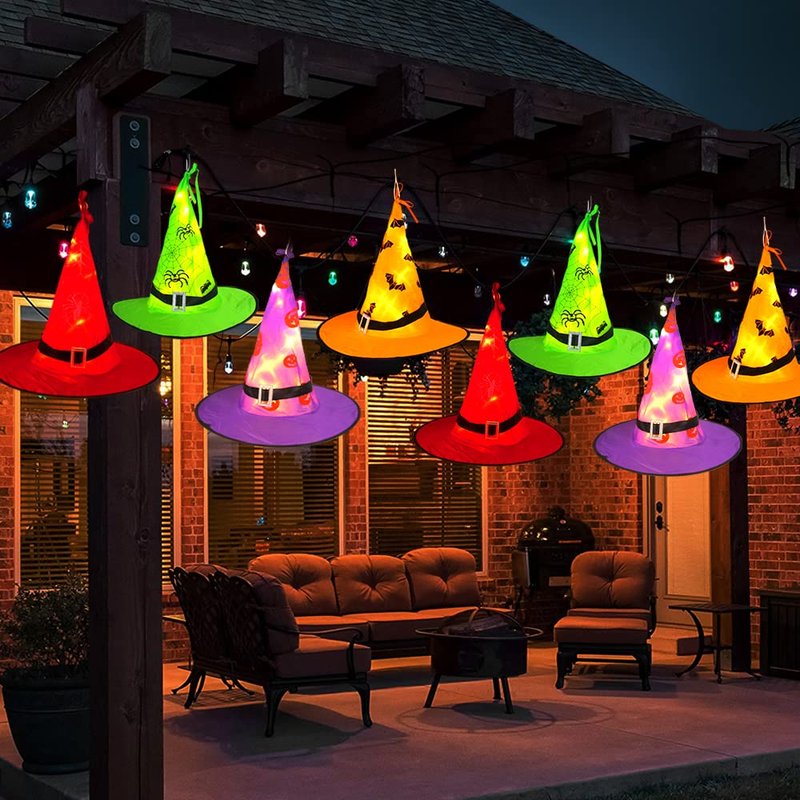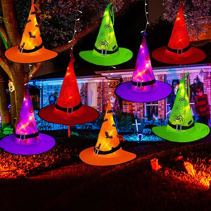 - 2023 Upgrade Glowing Witch Hat Lights: 2023 Upgrade Decorations Witches Hat Lights, specially adding Pumpkin, Spiders, Bats Cobweb, pattern on the hat, 8pcs Witch Hats: 2*Red, 2*Oranage, 2*Purple,2*Green, bring you a unique atmosphere to enjoy the Halloween Nights.