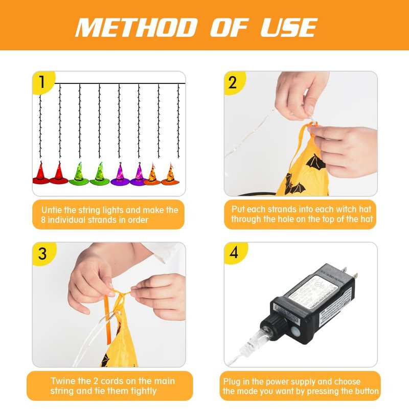 - 44FT + Brighter 104 LEDs:The String Lights of the glowing witch hat is of 44ft length, which allow more possibility for indoor and outdoor decorations. It is combining 8 witch hats with 8 individual strands, and applied in various occasions, such as Fancy dress party, Carnivals, Cosplay Decorations, Tree, Garden, Patio Decorations.