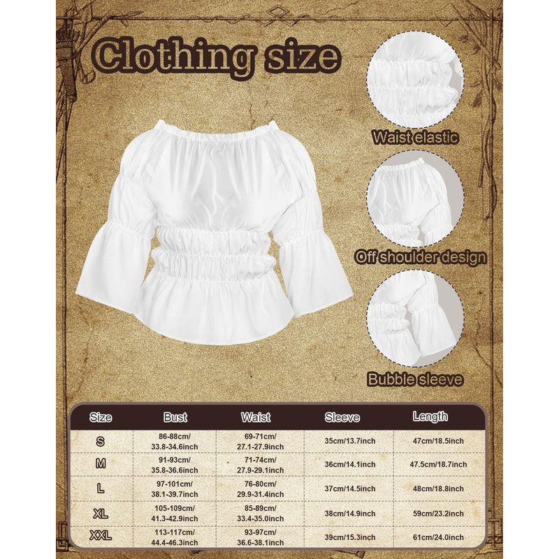 Features: Easy to Clean: Our medieval cosplay costume is washable, handwashing is recommended, easy to clean and keep, save your time and spice up your Halloween, serving you for a long time. Halloween party outfit: Our renaissance outfit is the ideal choice for a spooky costume party. The corset belt can help to show off your natural curve as well. Specifications: Material: Renaissance costume tops: polyester Corset belt: PU leather Viking belt: PU leather Medieval bag: PU leather Medieval sword holder: PU leather Color: as shown in the picture Size: as shown in the picture Package includes: 1 x Renaissance costume top 1 x Corset belt 1 x Viking belt 1 x Medieval bag 1 x Medieval sword holder Notes: Manual measurement, please allow slight errors on size. The color may exist a slight difference due to different screen displays. Please stop applying if there is any discomfort. Please do not wash our products with other clothes, and bleaching is not allowed. Winding risk may exist, please keep our product away from children. Please check the size information before purchasing.