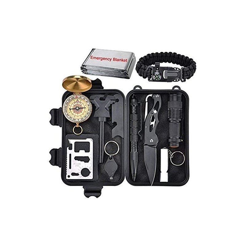 - ➤【ALL IN ONE SURVIVAL KIT FOR EXTREME ADVENTURES】This all in one survival kit contains everything that any survivalist or outdoor enthusiast would need. Includes emergency blanket, fire starter, scraper, compass, swiss card, flashlight, whistle, Survival Bracelet and black box etc
