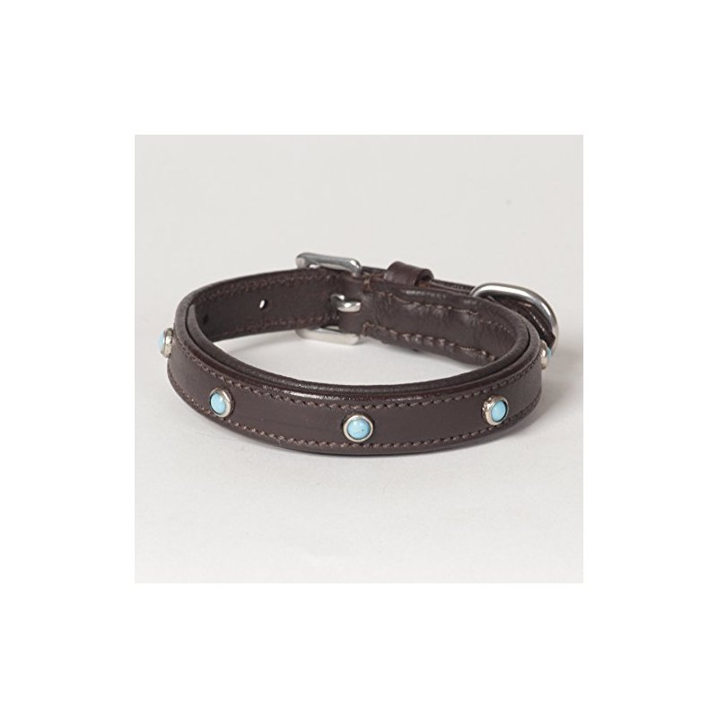Inspired by traditional American Indian handicraft, turquoise colored beads contrast beautifully with the dark genuine Havana leather. The unique and innovative design of this genuine leather dog collar guarantees admiration wherever you and your best friend might be. Available in 6 sizes: XX-Small though X-Large