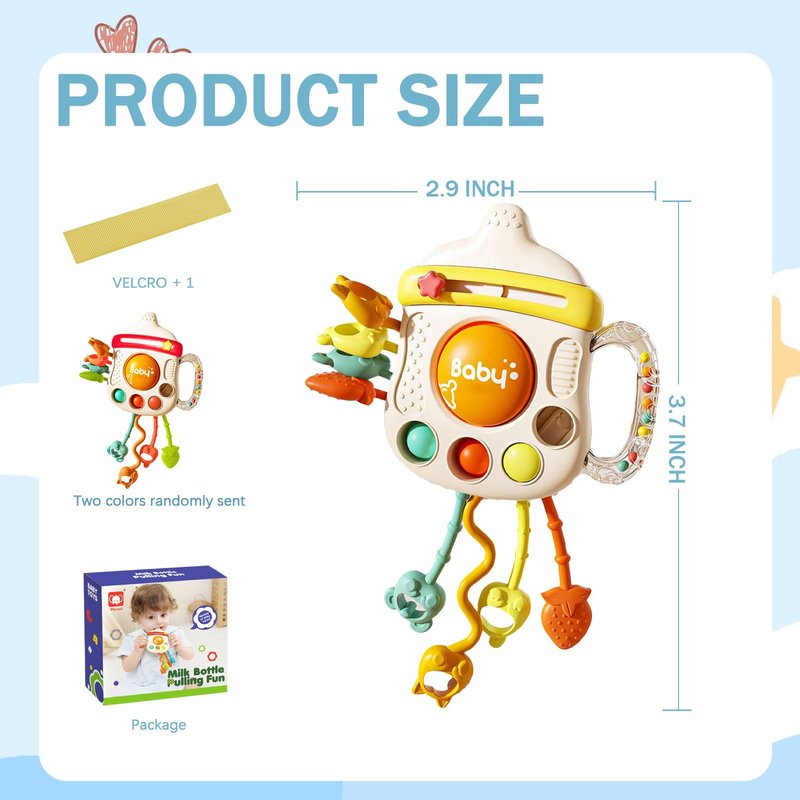 Introduce your baby to a world of sensory exploration with the Montessori Pull String Toy. This versatile pull string toy for babies is made from food-grade silicone and can be pulled, pressed, pushed, and chewed, offering endless entertainment and developmental benefits. Shaped like a baby bottle with convenient handles, it's easy for little hands to grasp. The transparent handles contain colorful beads that rattle when shaken, captivating your baby’s attention and stimulating their senses. The vibrant colors enhance visual stimulation, while the overall design helps improve hand-eye coordination, auditory perception, and finger dexterity, all while soothing teething gums. Perfect for babies aged 6-12 months, this teether toy is an essential addition to your toddler sensory toys collection.