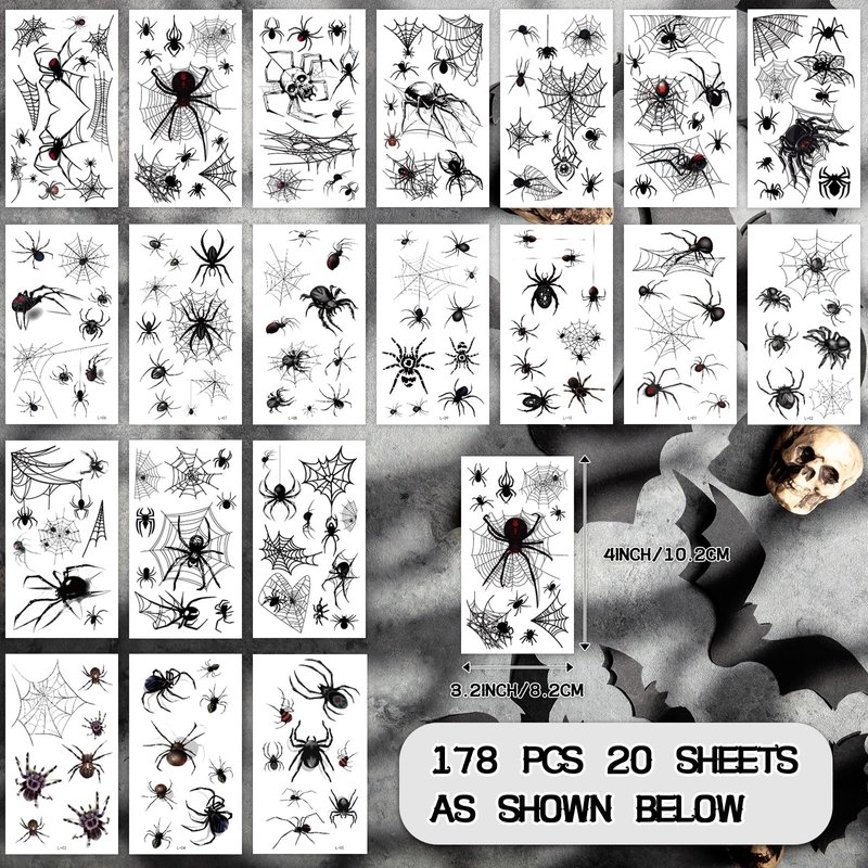 - 178-Piece Spider Web Tattoo Kit: This comprehensive set includes 20 sheets of spider-themed Halloween temporary tattoo stickers, featuring a total of 178 patterns for you to choose from and mix. Designed for Halloween makeup, it offers an array of spider web tattoos suitable for kids, adults, men, and women to create various spooky looks.