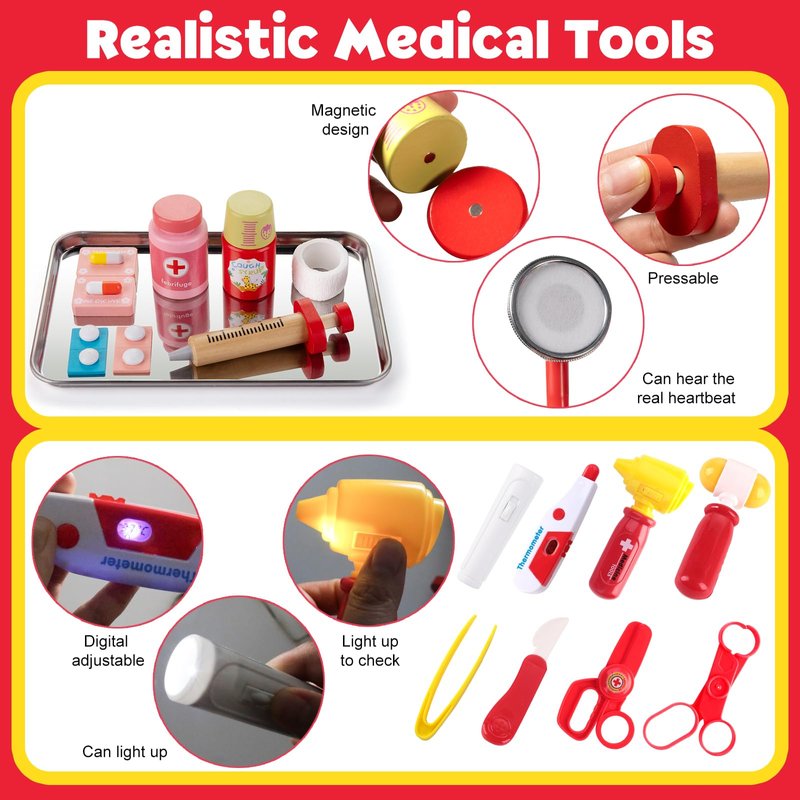 - SAFE AND NON-TOXIC: XZZO toddler doctor kit meets US Toy Standard and is made from high-quality materials. It includes smooth wood and non-toxic ABS plastic, ensuring it is safe for children. The tools are designed with no sharp edges, providing a secure play experience.