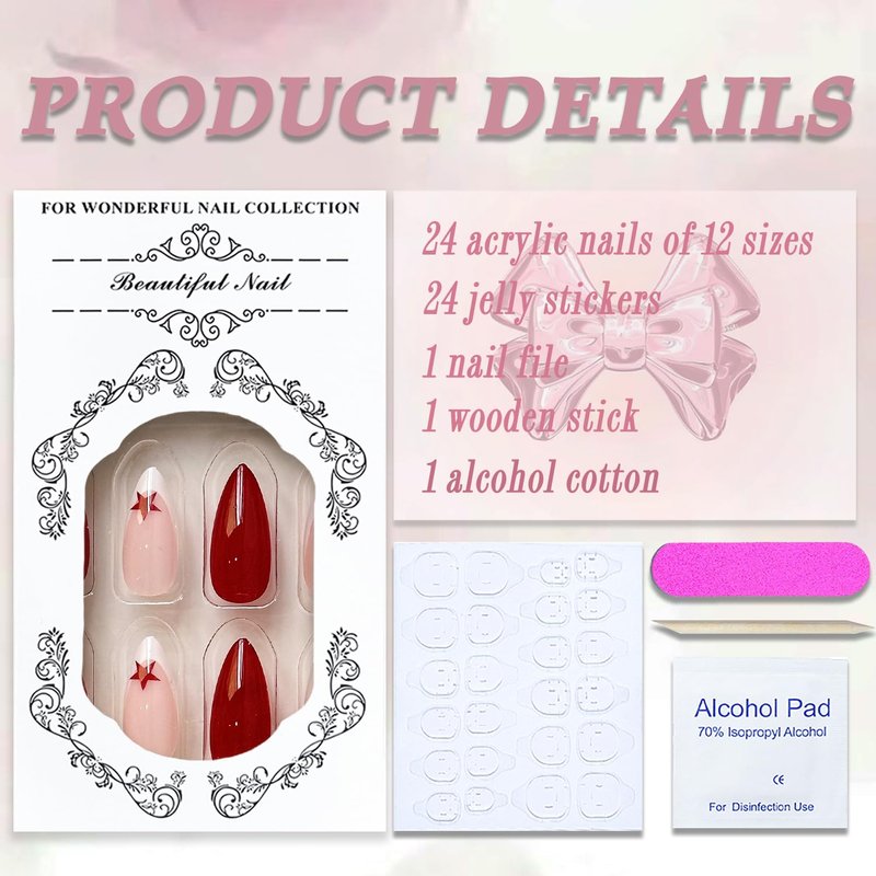 - 【Package Content】You will get 24 almond acrylic nails of 12 sizes, 1 nail file, 24 jelly stickers, and 1 wooden stick for removing false nails.