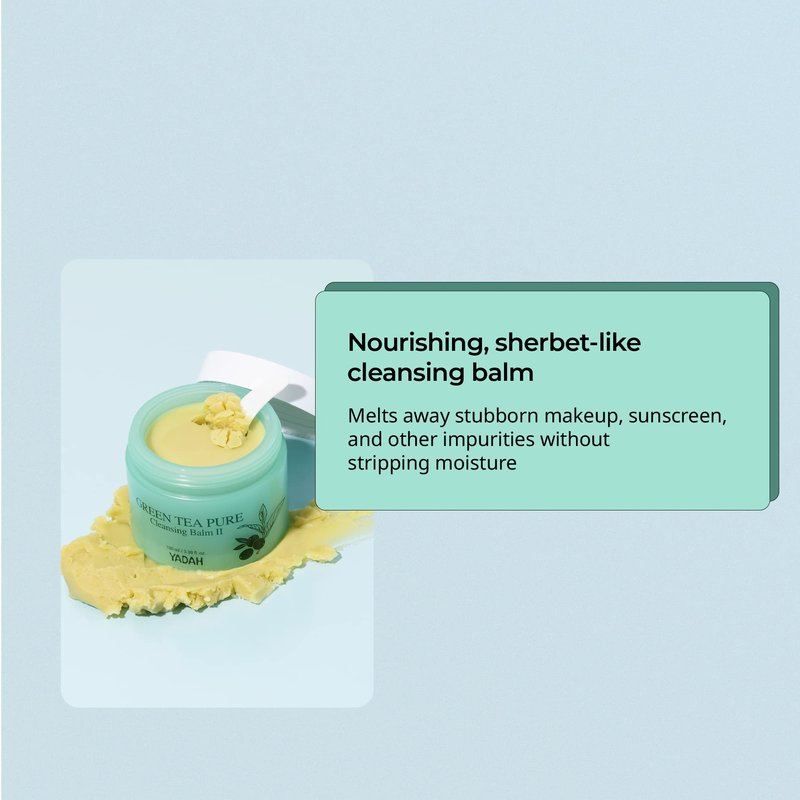 - YADAH GREEN TEA PURE CLEANSING BALM II (100ml/3.38fl oz) - This cleansing balm effectively melts away stubborn makeup and impurities without stripping moisture. Ideal for all skin types, it leaves skin refreshed, smooth, and deeply cleansed.