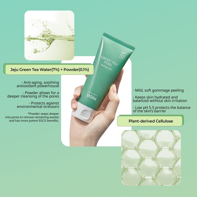 YADAH Green Tea Pure Peeling Gel, 3.4 Fl Oz - pH Balanced Exfoliating Gel with Natural Cellulose for Smooth, Resurface and Even Skin for Moisture Balance