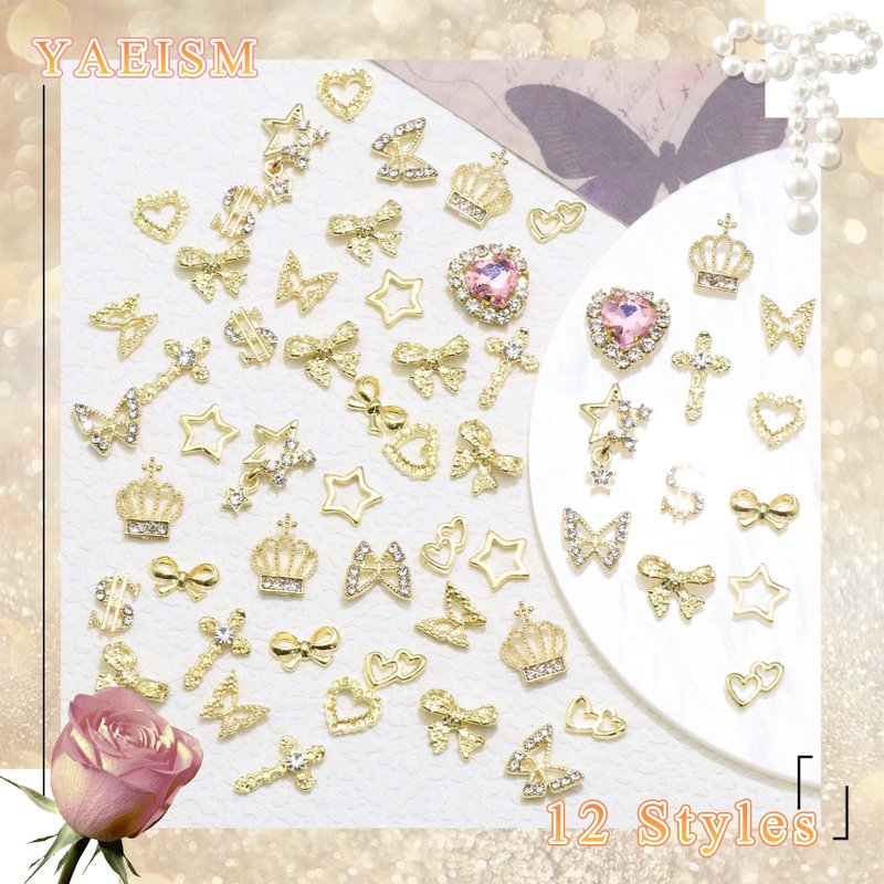 YAEISM 180PCS Gold Nail Charms Cross Crystal Star Nail Charms 3D Gold Butterfly Charms Sparkly Crown Nail Charms Shiny Dollar Sign Nail Charm Bling Cross Bowknot Starlight for Nail Art and DIY