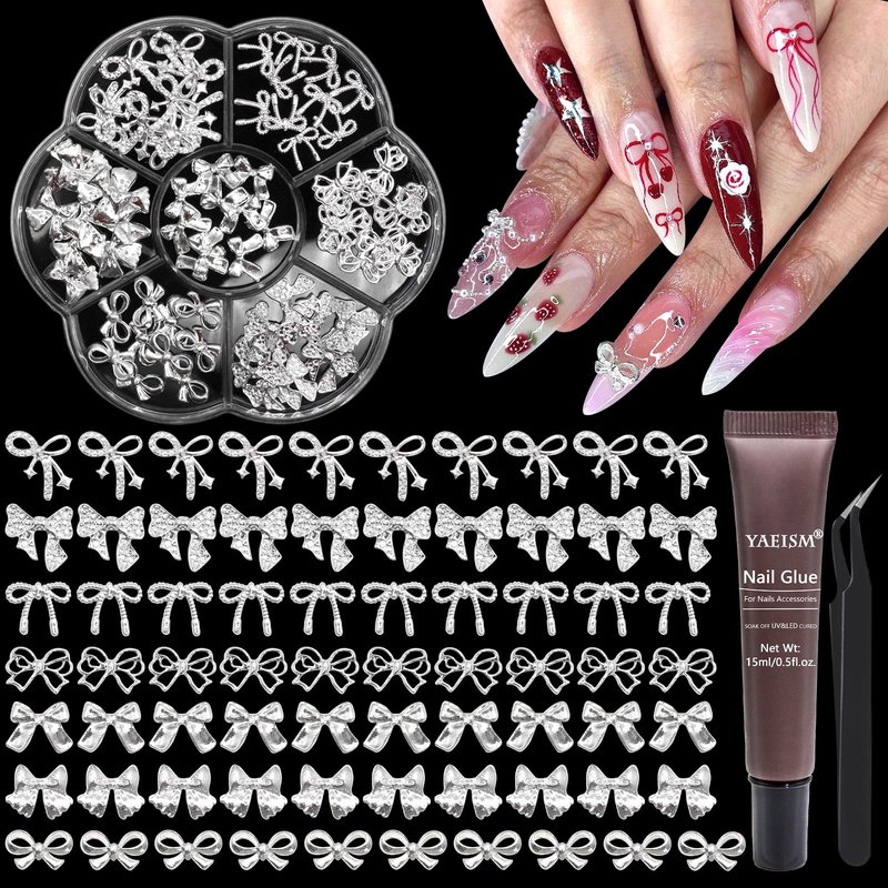 YAEISM Bow Nail Charms Silver Metal Bowknot Charms 70PCS Bow Nail Art Charms Kits with Glue Gel, Tweezer for Nail Art and DIY Crafts Decoration