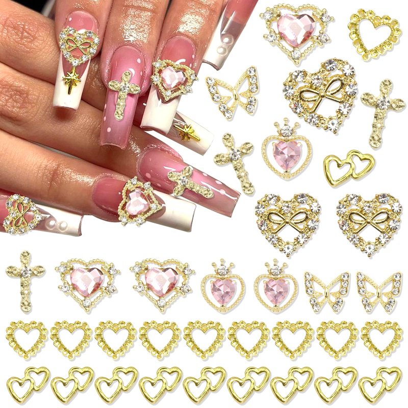 YAEISM Gold Nail Charms 35PCS Crystal Heart Nail Charms 3D Alloy Cross Nail Charms Metal Butterfly Charms Nail Rhinestones for Women Nail Art and DIY Crafts