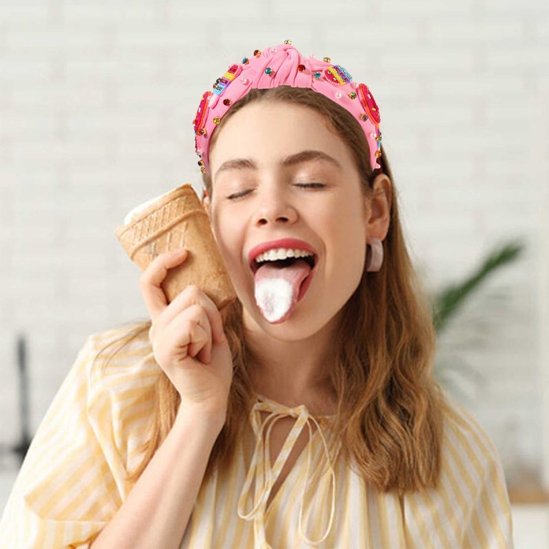 THE CLASSIC AND WONDERFUL ICE CREAM KNOTTED HEADBAND COMBINATION OF SUMMER ELEMENTS WILL SURE TO ATTRACT ATTENTION. IT IS ABSOLUTELY HYPOALLERGENIC, NO RISK AND WEAR ANYWHERE ANYTIME. EXCELLENT AND STYLISH CRAFTSMANSHIP MAKES YOU ATTRACTIVE IN ANY OCCASION.