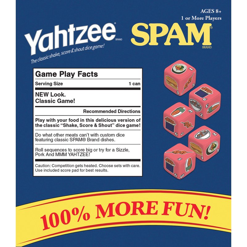 - Includes custom SPAM dice cup, custom scorepads and custom Yahtzee dice featuring unique icons - #1 Spam Sushi Roll, #2 Spam & Noodles, #3 Spam Musubi, #4 Fried Spam Sandwich, #5 Spam Kabobs, #6 Spam Fries