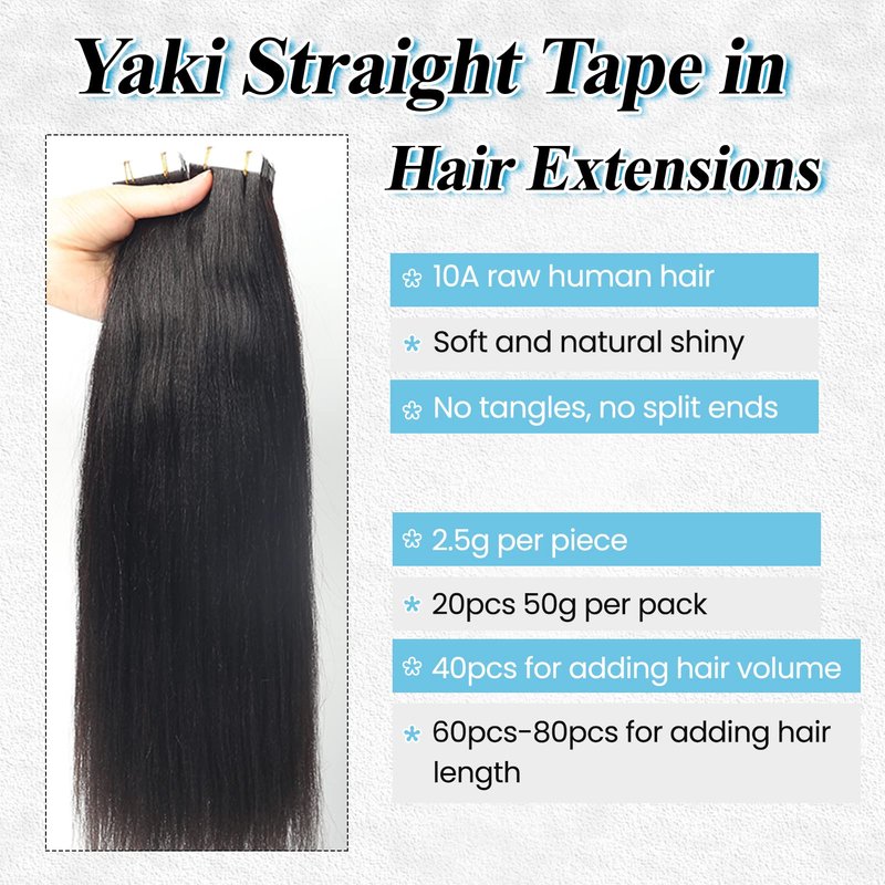 Tape in hair extensions is an easy way to add hair volume and length, you could DIY how many pieces and packs to us. Yaki straight human hair extensions looks just like your own hair, 10A grade human hair quality tape ins extensions is more durable.