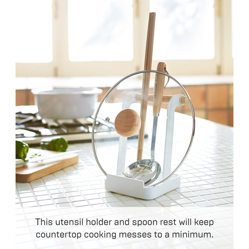 Yamazaki Home Ladle & Lid Rest - Kitchen Utensil Organizer Stand for Cooking Steel + Wood White
