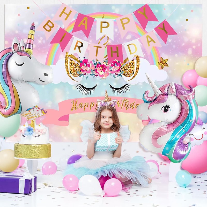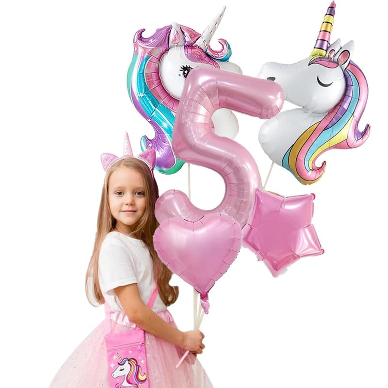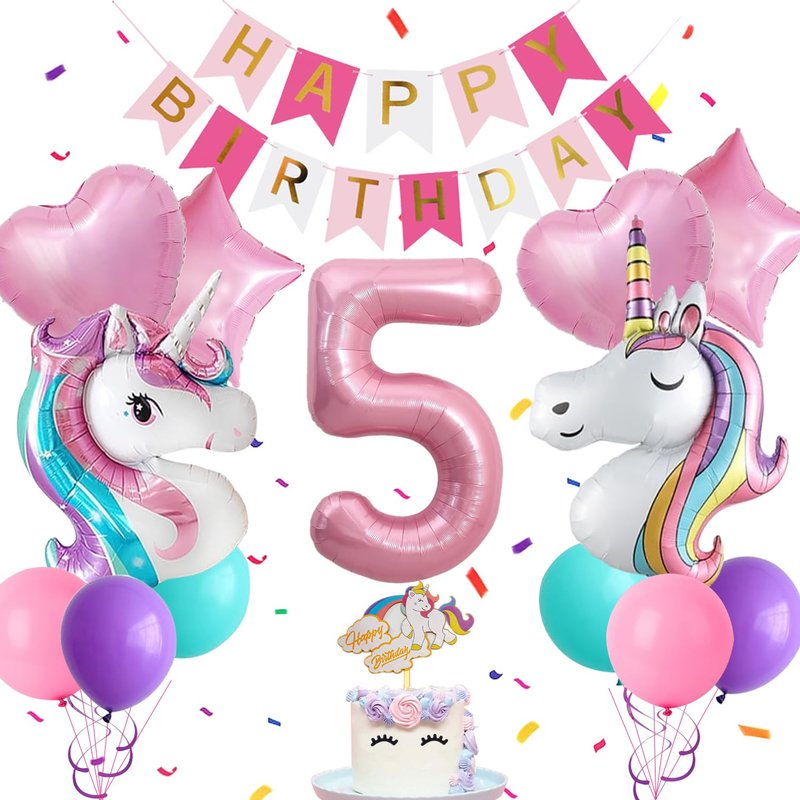 - 1. Unicorn Themed Birthday Decorations for Girls: This balloon set included happy birthday banner*1, foil unicorn balloon*2, foil heart balloon*2, foil star balloon*2, foil number 5 balloon*1, cake toppper*1, latex balloon*6