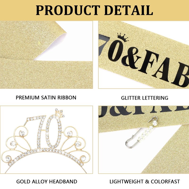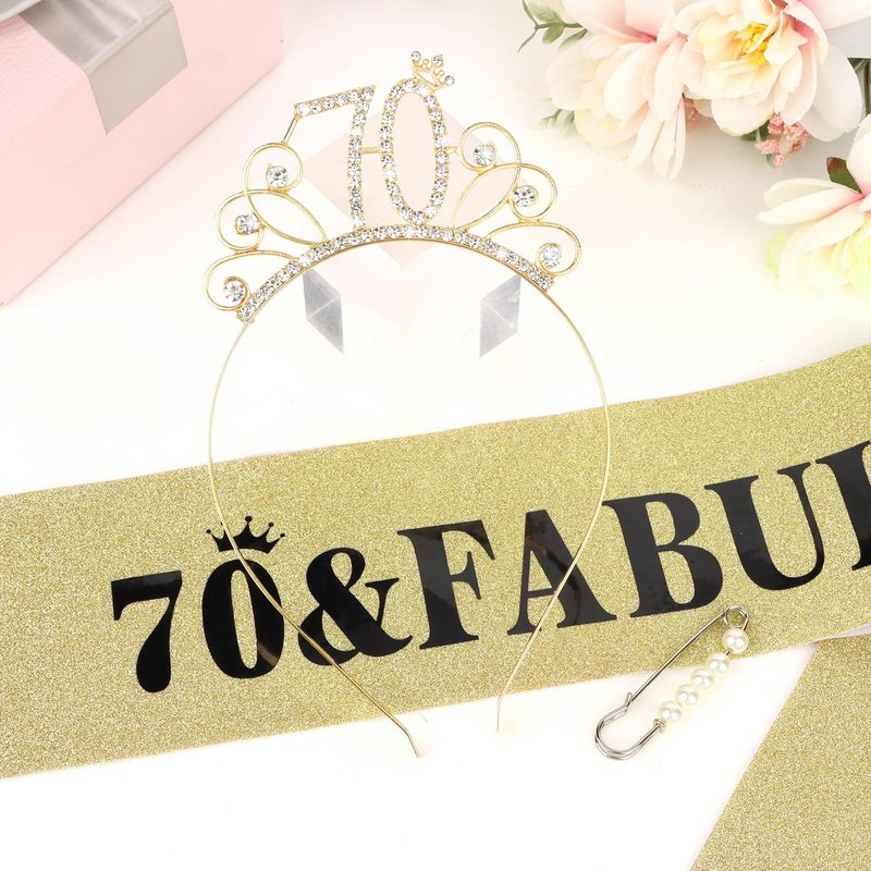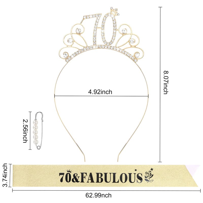 • 70 & Fabulous Birthday Sash: The birthday sash is made of soft, glittery fabric with hot foil stamping to match any outfit. The sash comes with a cute and durable pearl pin to adjust the sash to your needs, which will hold the delicate crown securely on your head, making it easy to wear for most body types. Our sparkling sashe fits everyone!