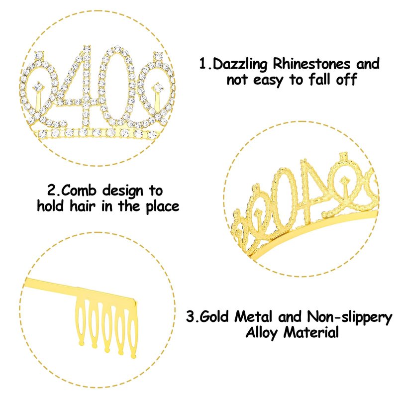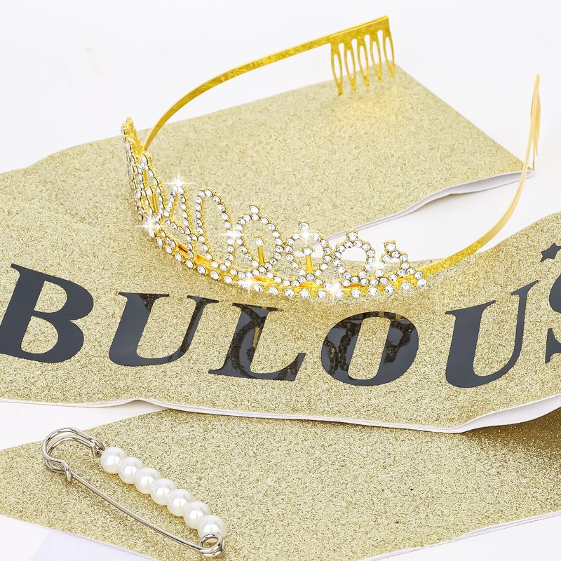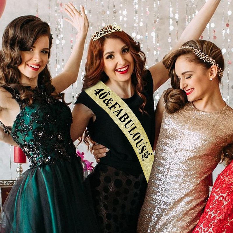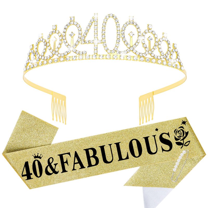 - Perfect for Birthday Party Set: "40 & Fabulous" gold satin sash and a gold rhinestone crown with a beautiful pearl pin. When worn, the Queen's temperament is immediately apparent and the crowd will be dazzled.