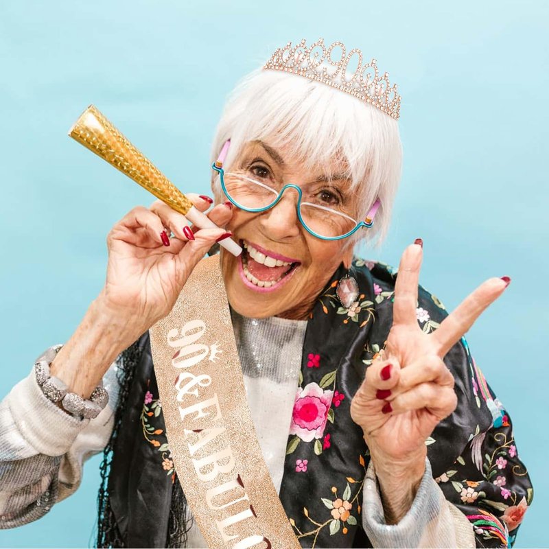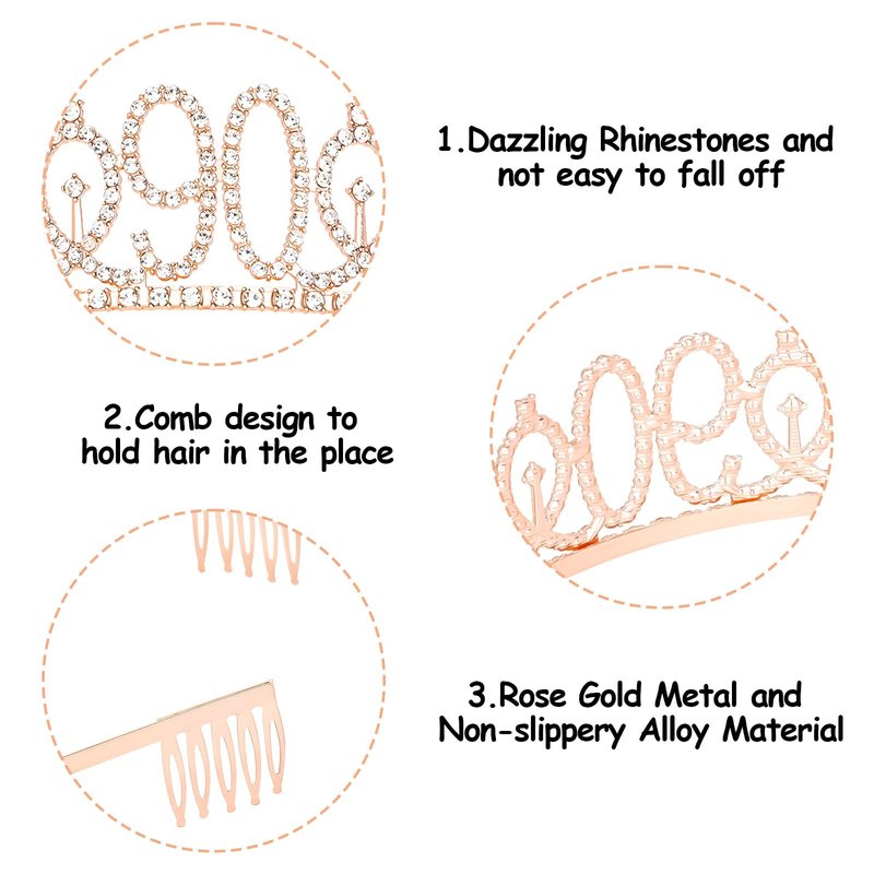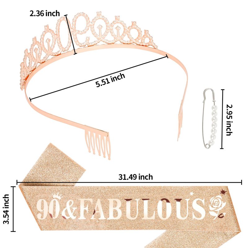 - Perfect for Birthday Party Set: "90 & Fabulous" rose gold satin sash and a rose gold rhinestone crown with a beautiful pearl pin. When worn, the Queen's temperament is immediately apparent and the crowd will be dazzled.