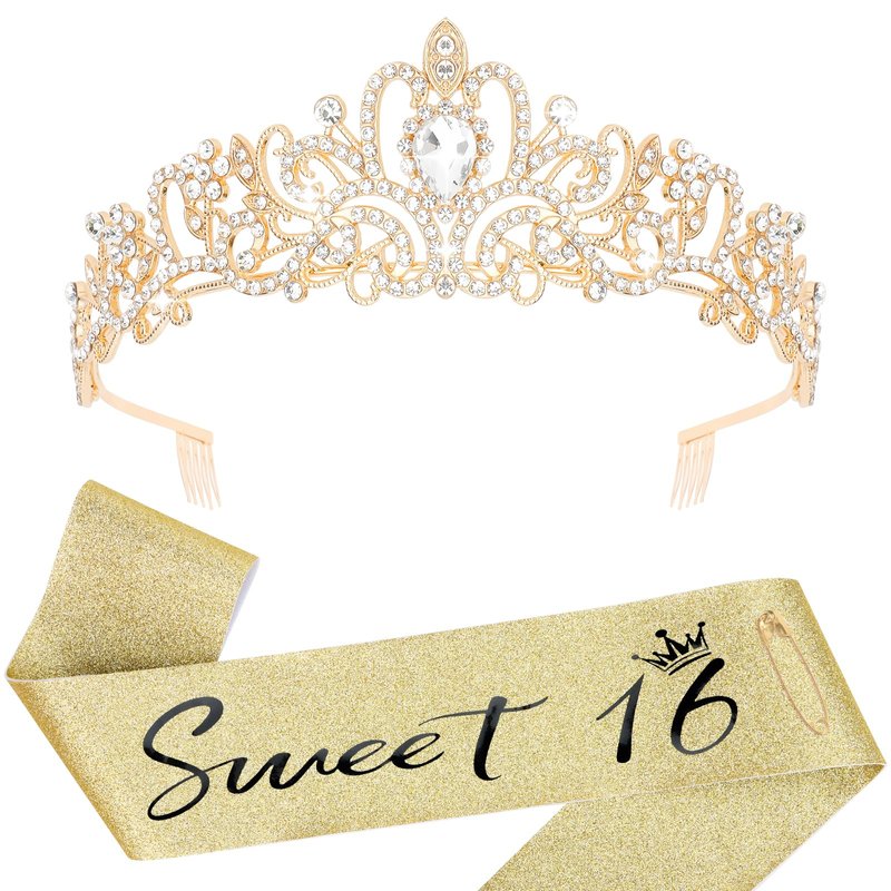 - Perfect for Birthday Party Set: "Sweet 16" Gold satin sash and a gold rhinestone crown. When worn, the Princess's temperament is immediately apparent and the crowd will be dazzled.