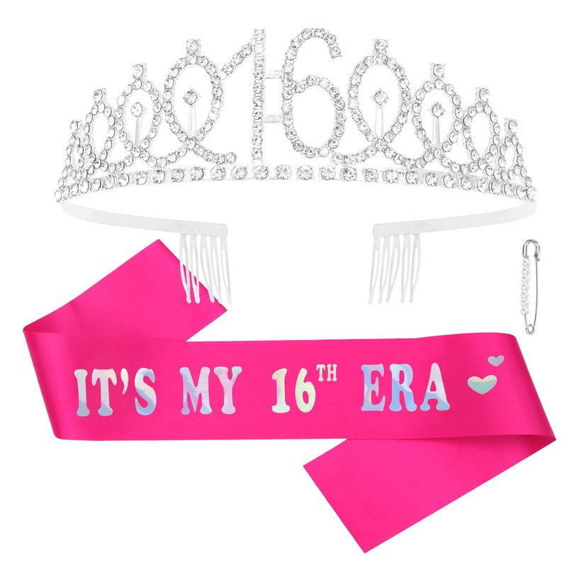 - Perfect Set for Birthday Party: 'IT'S MY 16TH ERA' Hot Pink Satin Sash + Silver Alloy and Rhinestone Crown; Crown measures 5 inches in diameter and 1.5 inches tall; The "Sweet 16" sash is 3.7 inches wide and 63 inches long; When worn, the princess look is instantly apparent and dazzling