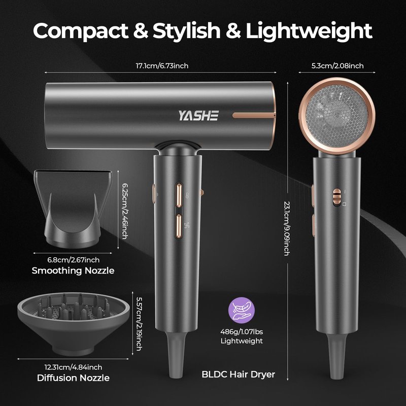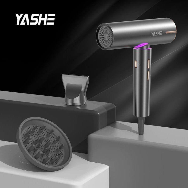 - Powerful High-Speed Drying: Featuring a robust 110,000 RPM brushless motor, the YASHE hair dryer delivers a strong airflow of up to 23 m/s, ensuring ultra-fast drying in just 1-6 minutes. Ideal for professionals and home users alike, this high speed hair dryer offers a compact design for enhanced comfort during use