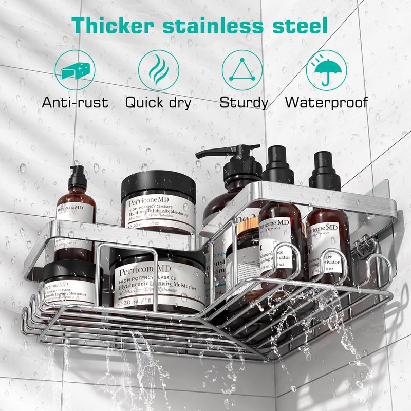 - Rust-Proof and Thicker Solid Frame: The corner shower caddy frame is made of stainless steel, coated with rustproof paint, and thickened wire than those shower caddies on the market. This adhesive shower caddy remains rust-free and maintains a high sheen for years