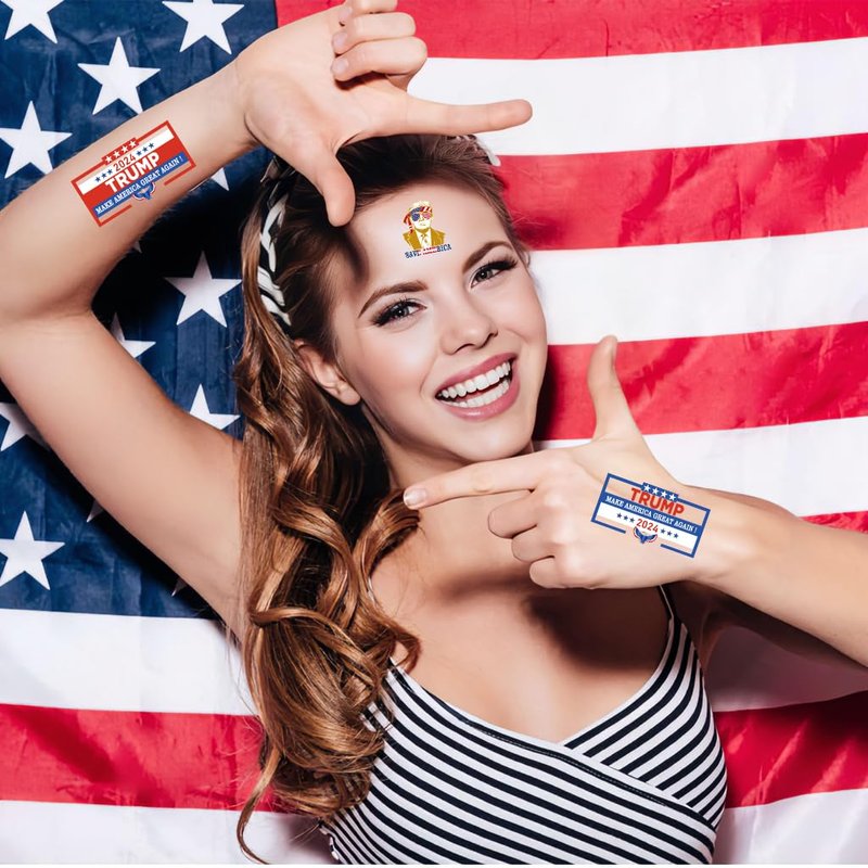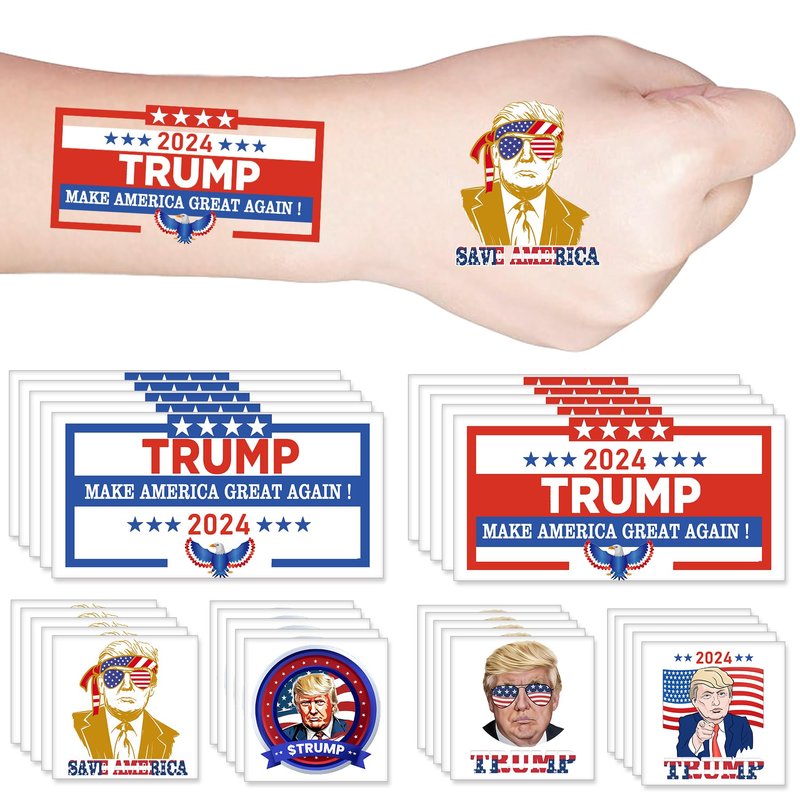 - Novelty Item: Temporary tattoos featuring the image and likeness of Donald Trump.