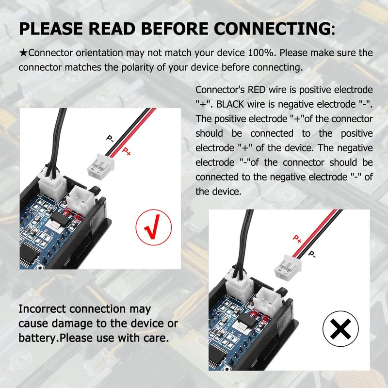 - WARNING: The batteries connectors type are all JST PH2.0MM . —THE CONNECTORS ARE NOT UNIVERSAL! ! !— Please make sure that the CONNECTOR TYPE, POLARITY , and BATTERY SIZE match your device before purchasing. —If the POLARITY of the connector DOES NOT MATCH that of your device, it will DAMAGE the device or the new battery.—