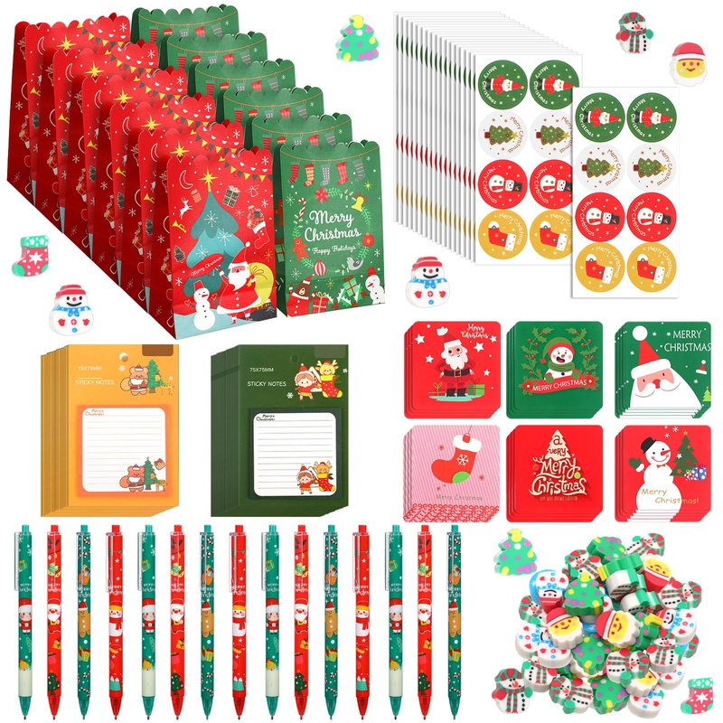 Yeaqee 144 Pcs Christmas Party Favor Bulk Pack Includes Christmas Ballpoint Pens Erasers Sticky Notes Gift Bags Cards and Stickers for Gift Exchange Prizes