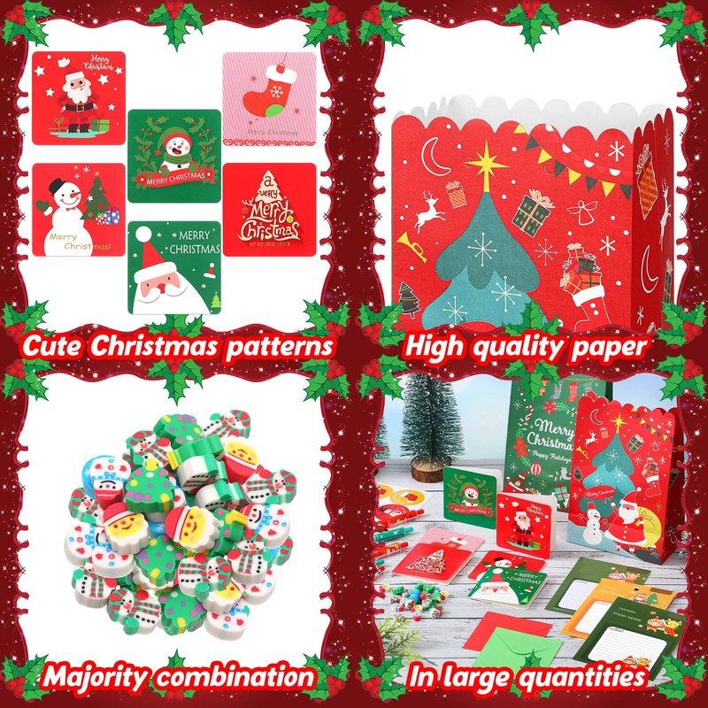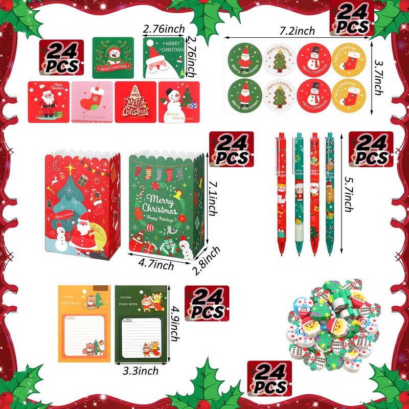 - Christmas Supplies: the package includes 24 Christmas pens, 3 sheets of Christmas stickers (24 pieces in total), 24 Christmas cards, 24 Christmas gift bags, 24 Christmas erasers, 24 Christmas sticky notes, bringing you a complete Christmas set, satisfying your daily use, bringing a strong Christmas atmosphere to your life