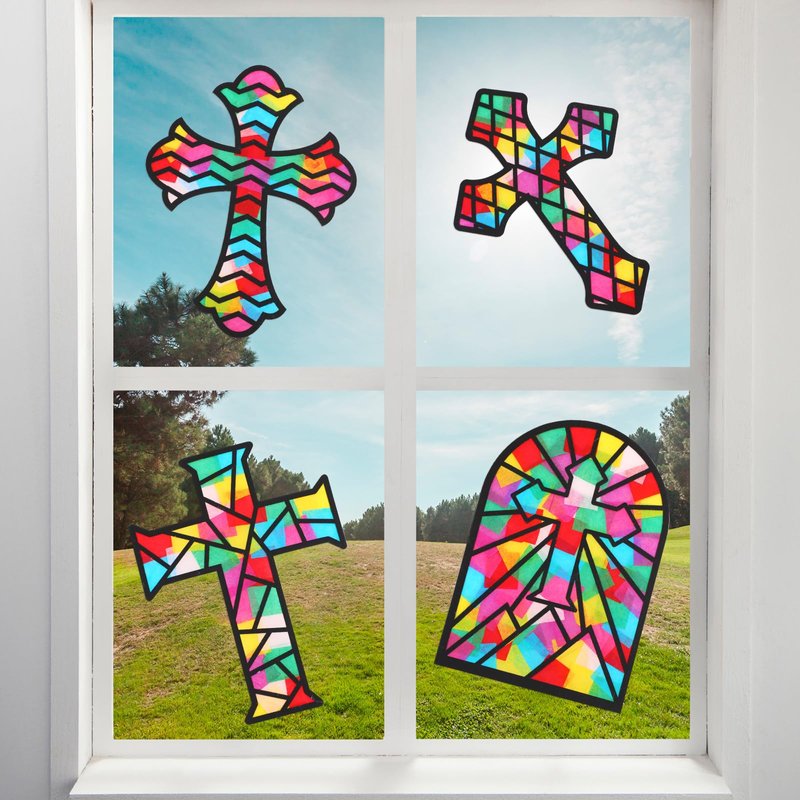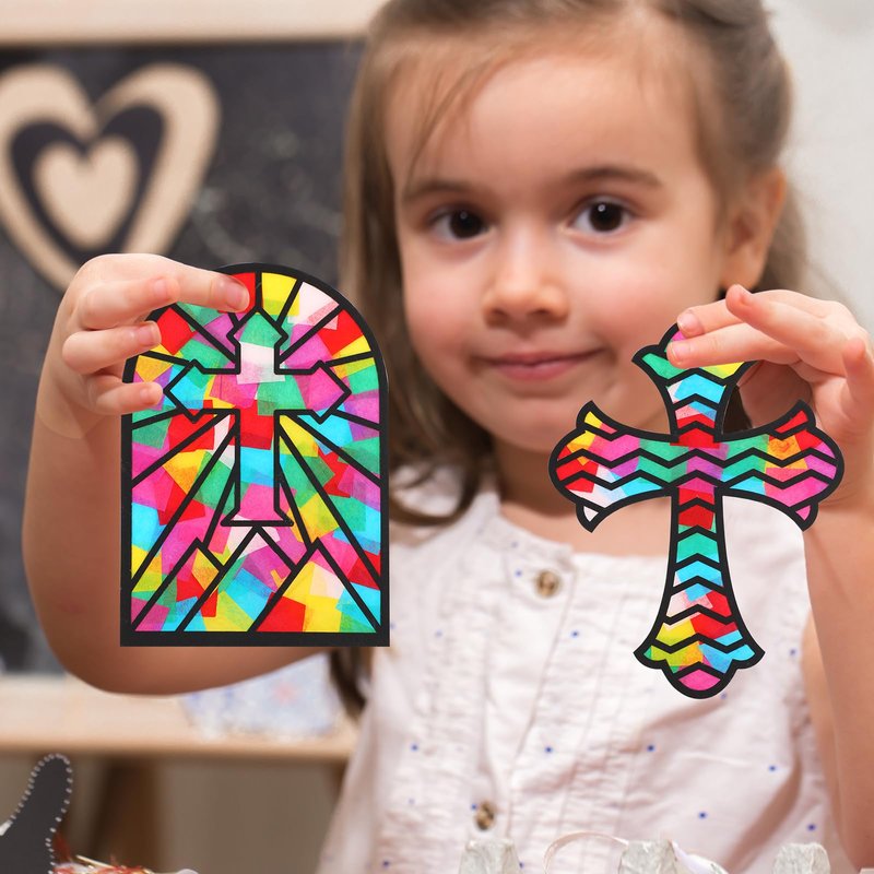 Yeaqee 24 Pack DIY Suncatcher Paper Crafts Stained Glass Effect Paper Suncatchers, 700 Tissue Papers, Window Art Arts and Crafts for Party Favors Toys(Cross)