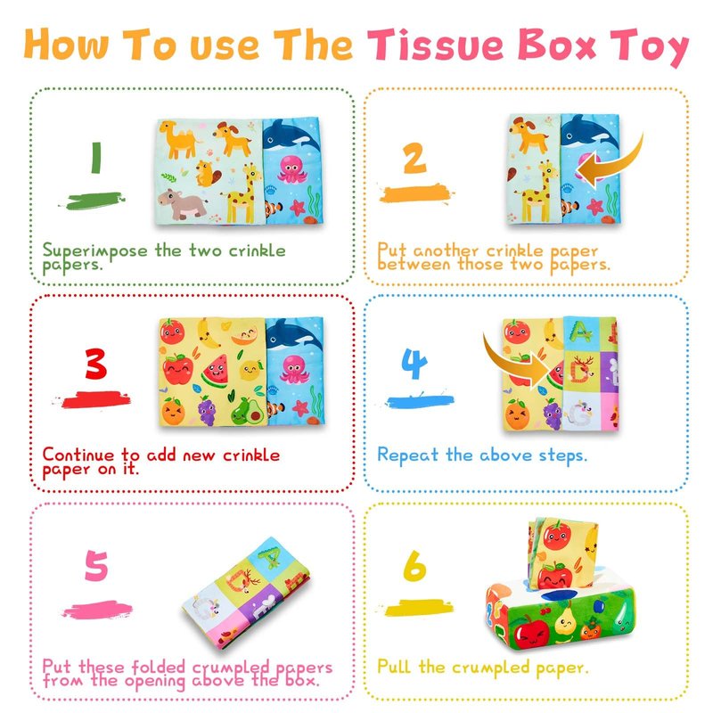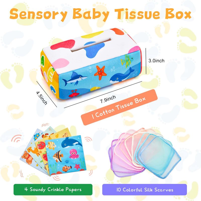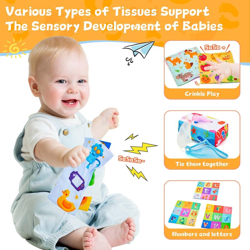 - [Promotes Sensory Development]The colorful tissues help babies with their vision, while the different textures improve their sense of touch
