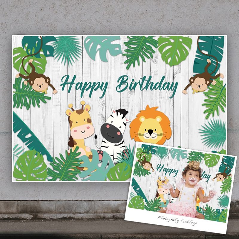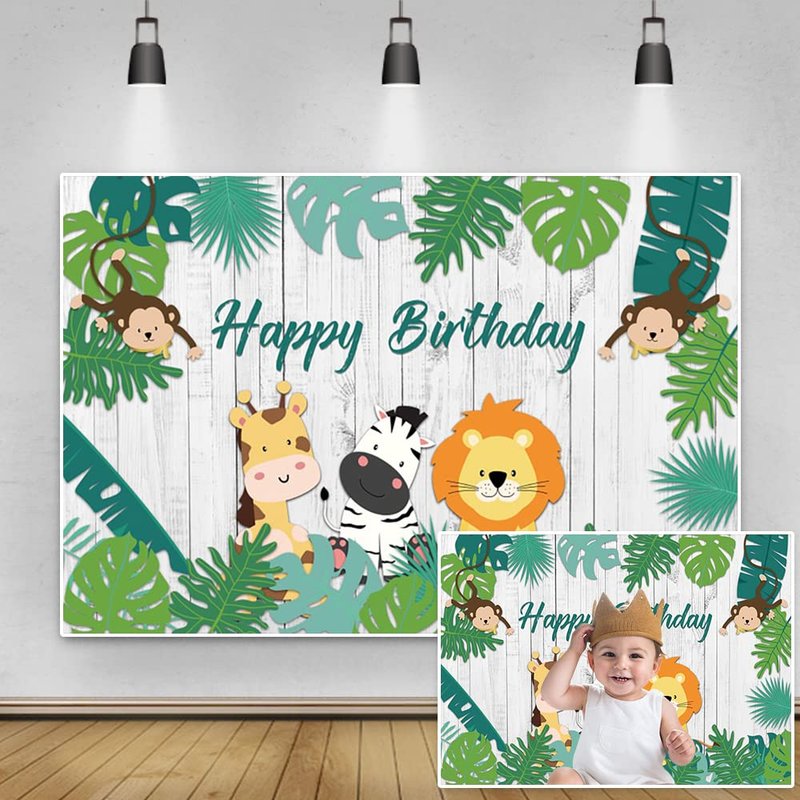 Yeele 7x5ft Safari Animals Happy Birthday Backdrop Jungle Wildlife Tropical Green Leaves Rustic Wooden Photography Background for Kids Birthday Party Decorations Cake Table Banner Supplies Vinyl