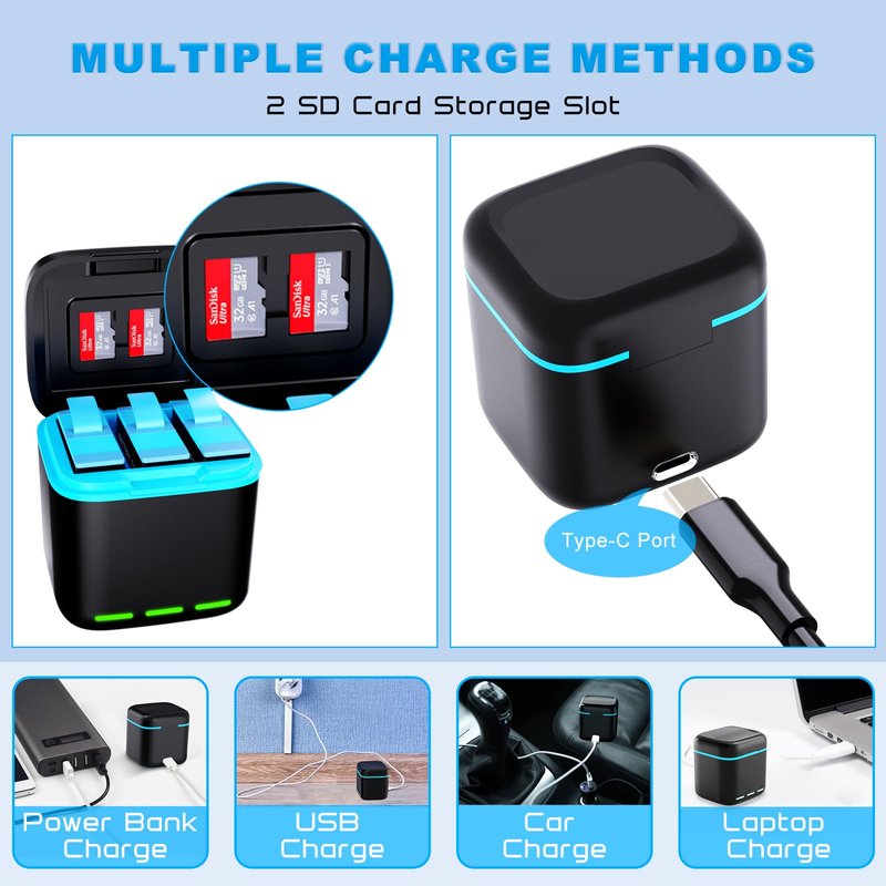 - 【Storage Design Charger】3-Channel unique and compact Charger designed with a closed lid with 2 SD card slot, can storage and charge 3-Pack Hero 12/ 11/ 10/ 9 batteries simultaneously. The cover of the charger has a magnetic suction design. And the battery charger staion with Smart LED Indicator Light, Red for charging, Green for charging completed.