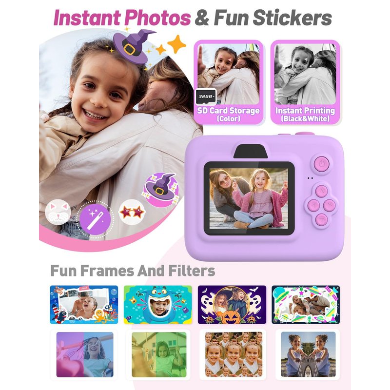 - Extra Long Life And Capacity : The Kids Instant Print Camera has a built-in 2000MAH capacity battery, which can support 3 hours of continuous shooting after fully charged, about 20,000 photos or two hours of continuous camera video. It also comes with a 32GB SD card, which can hold 60,000 photos of about 500KB, and the camera screen can view the photos and videos in the memory card. As a kid's camera toy, give them the opportunity to explore the world and record their growth by taking photos