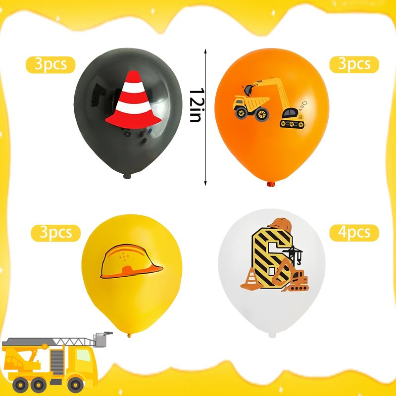 - 🎈 Boys Girls Construction Birthday Balloons Pack: 12 inch Yellow Balloons with Safety Helmet Printed (3pcs) + 12 inch White Balloons with 4th Construction Printed (3pcs) + 12 inch Black Balloons with Safety Cone Printed (3pcs) + 12 inch Orange Balloons with Excavator (3pcs) + 1 pc random balloon spare + 1 pc 32ft long balloon ribbon.