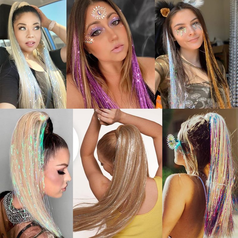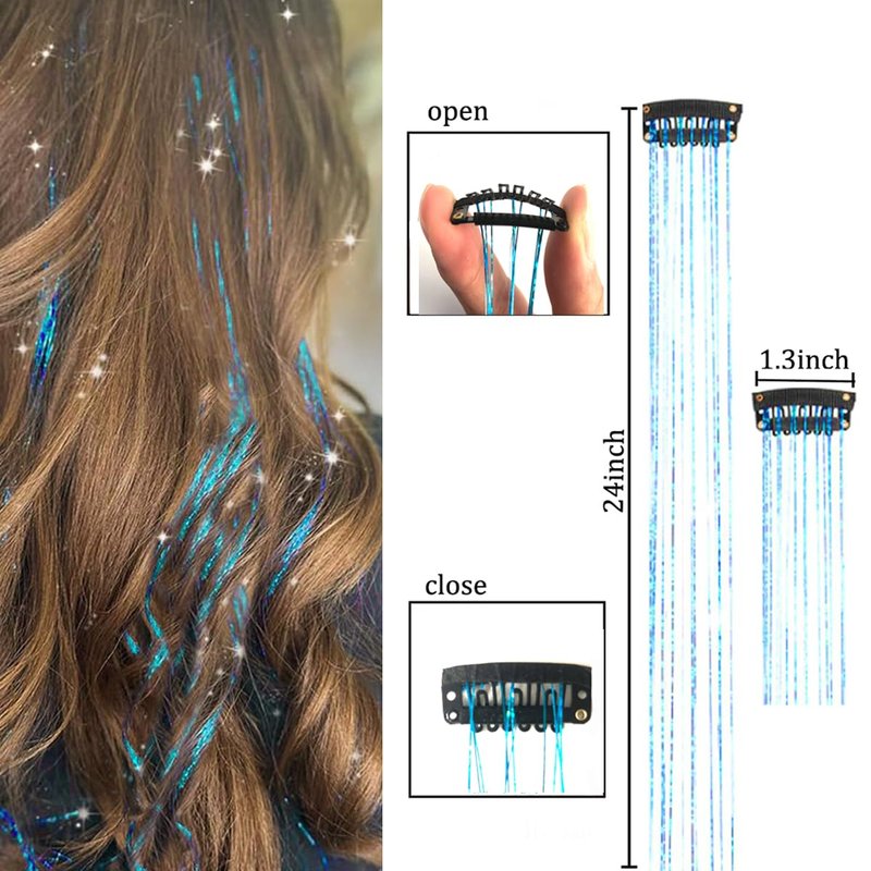 - 4. 【Lengh of Hair Tinsel 】: 24 inches, the glitter extensions can be trimmed to match your desired hair length. So you can wear it with a blow dryer or curling iron to curl your hair. -- The perfect hair accessory for girls of all ages