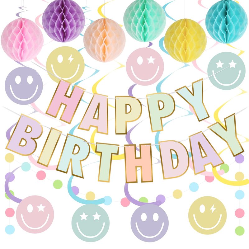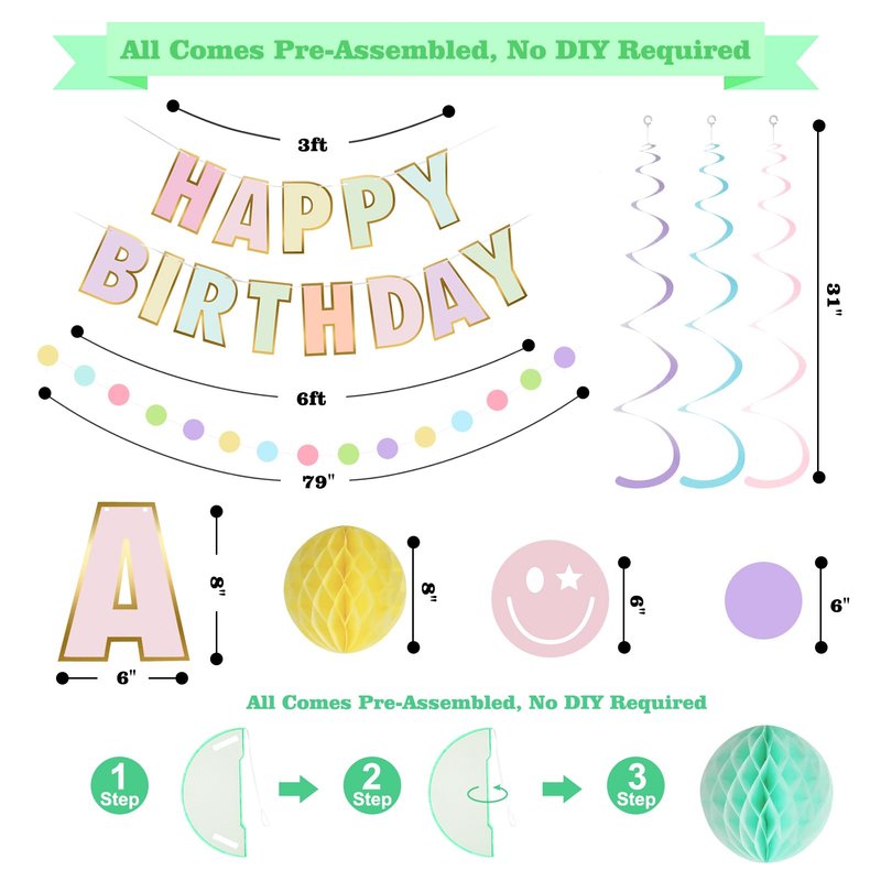 - Package Included: You can get 1pcs Pre-Strung Happy Birthday Banner, 6pcs Honeycomb Balls, 8pcs Hanging Swirls Streamers, and 1pcs Circle Dots garland. No need to worry about running around and finding individual items. With our party decoration package, you'll have everything you need to create the perfect party atmosphere.
