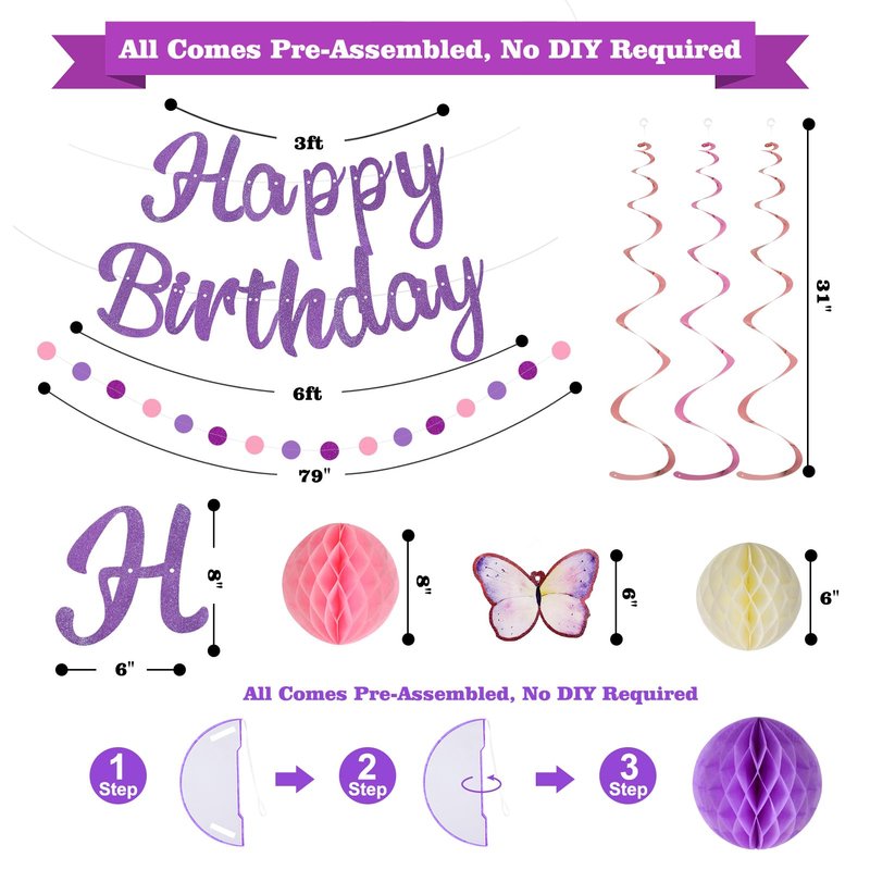 YEOCU Birthday Decorations, NO DIY, Pre-Strung Happy Birthday Banner with Honeycomb Balls, Hanging Swirls, Circle Dots Garland, Happy Birthday Party Decorations for Women Men Boys Girls (Purple)