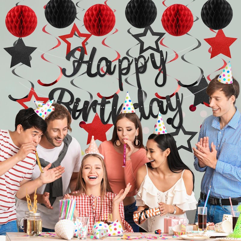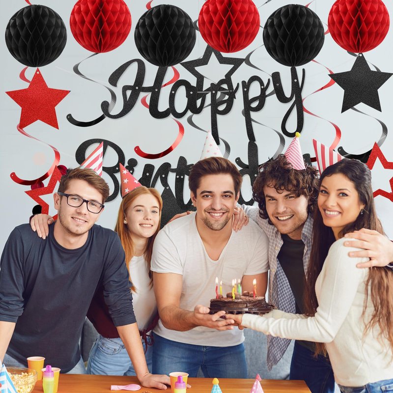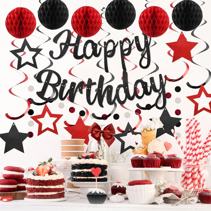 YEOCU Birthday Decorations, NO DIY, Pre-Strung Happy Birthday Banner with Honeycomb Balls, Hanging Swirls, Circle Dots Garland, Happy Birthday Party Decorations for Women Men Boys Girls (Red & Black)