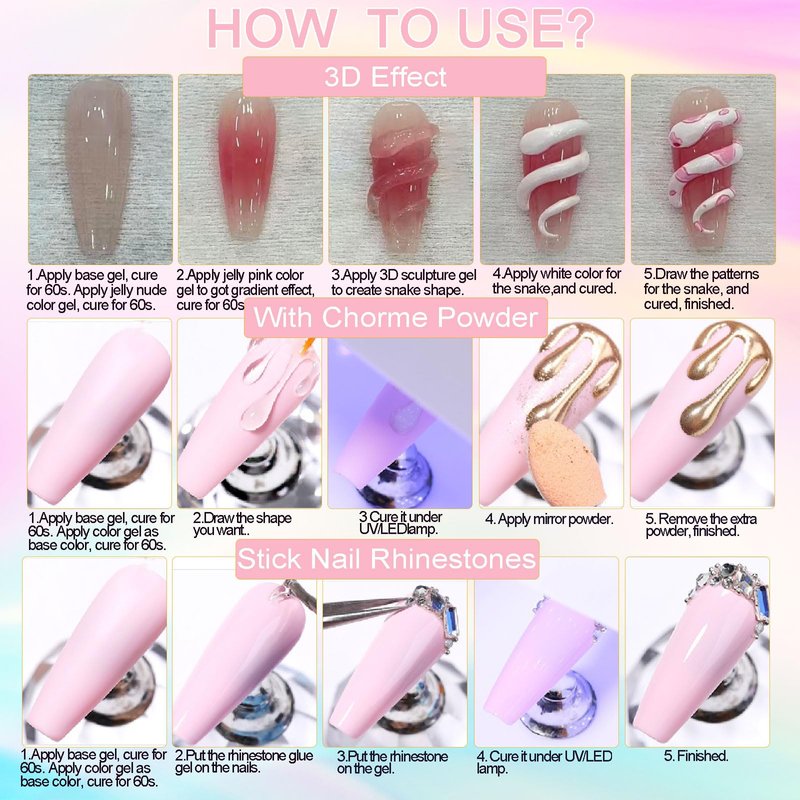 - 5d Gel for Nail Art: This 3d sculpting gel is design for trendy 3d lines design and 3d chrome nail art. And you can DIY different designs with this sculpting gel, such as flowers, bear, star, moon, heart, every shape you want and use the 3D silicone molds if you feel patterns are difficult to DIY